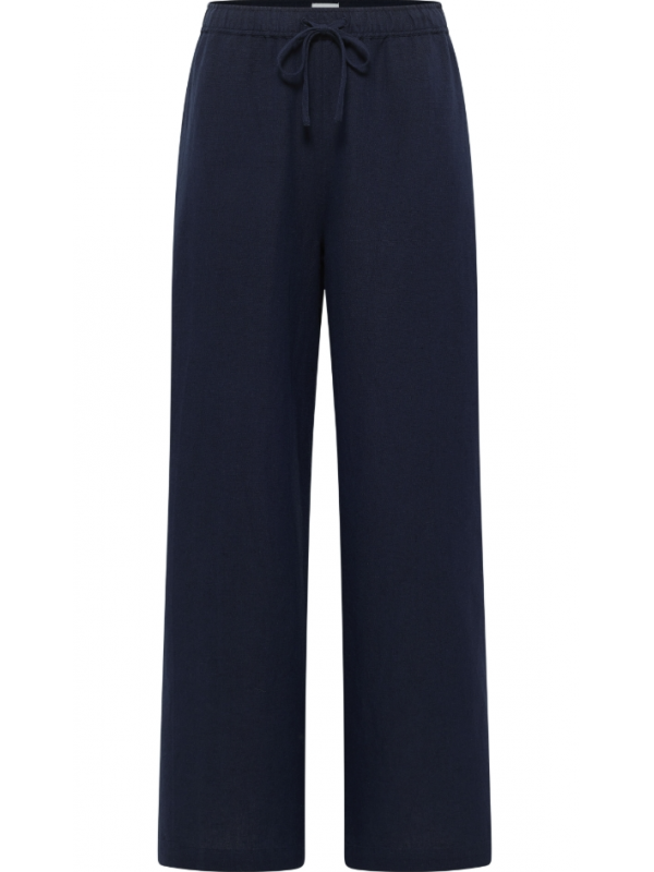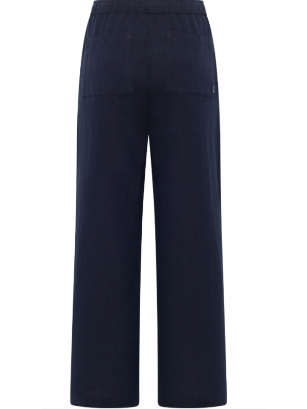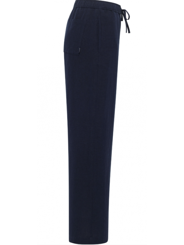 Velice příjemné dámské kalhoty z lehkého materiálu. Střední sed, tmavě modrá barva, v pase na gumu na stažení