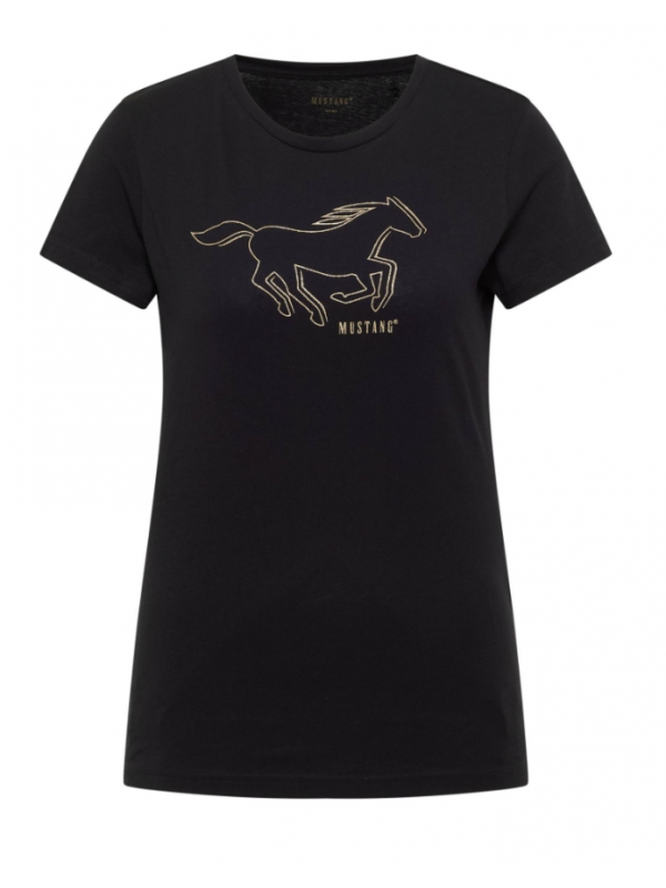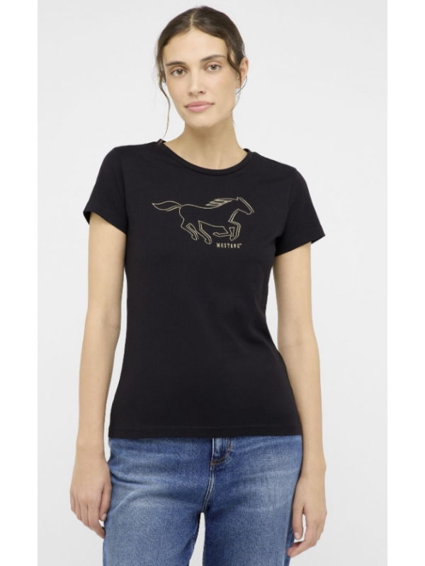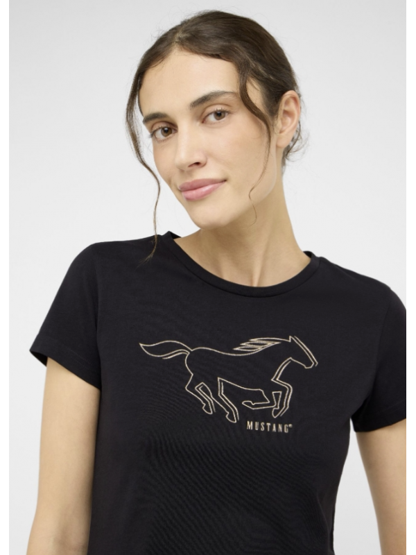Toto tričko z Mustangu zaujme klasickým kulatým výstřihem, krátkým rukávem a rovným lemem.
